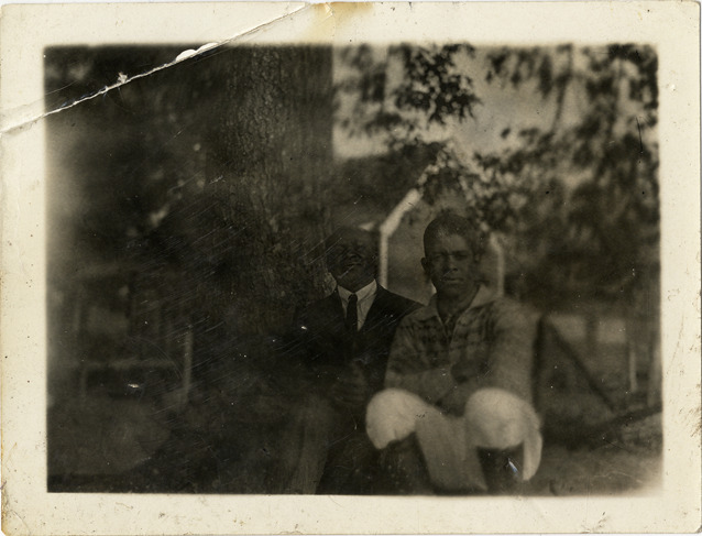 Portrait of tenor Roland Hayes and Professor Wilkin Greene, standing next to a tree at Angelmo Farm in Curryville, Georgia. Handwritten on back: "Roland Hayes and Wilkin Greene at Angelmo Farm, Curryville, Ga. Prof. Greene a graduate of Atlanta Baptist College taught Roland his first [undecipherable] lessons, and awakened in him through poetic vibration his keen sense of poetic expression when Roland was ten years old."