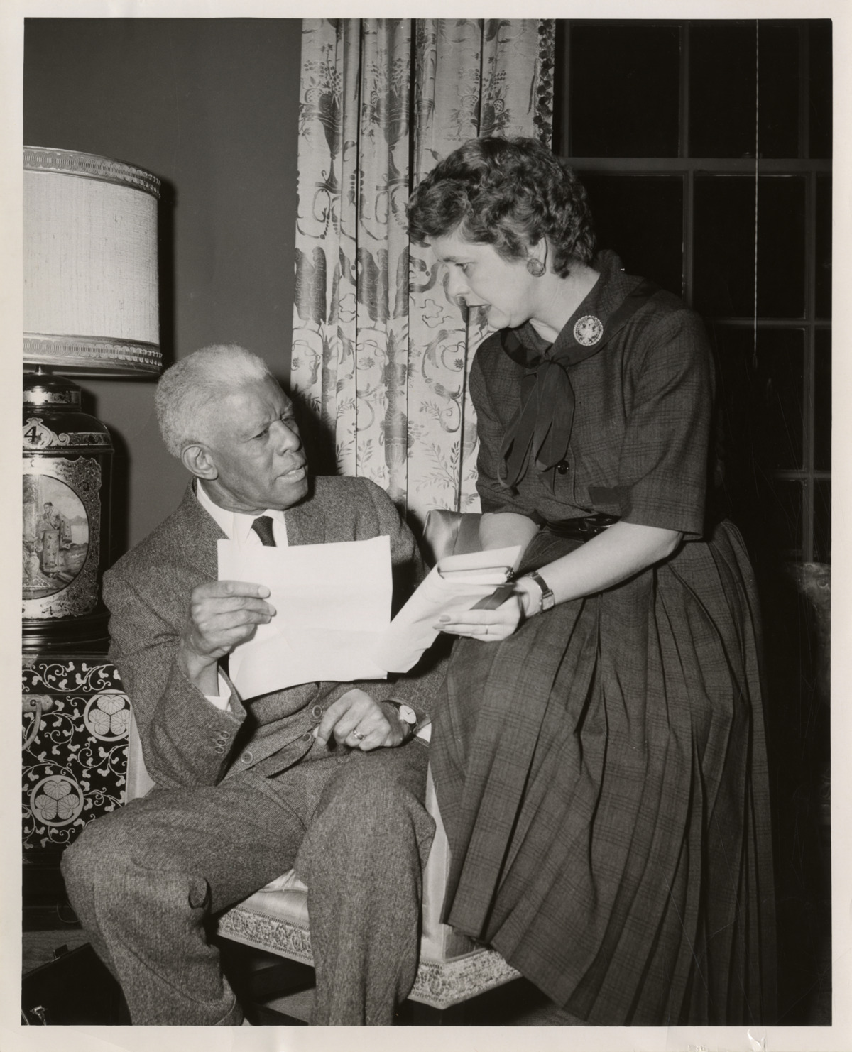 View of tenor Roland Hayes, sitting in chair, and Jeannie Boaz, of the Metropolitan Opera auditions conference, examining some documents. Lamp in background. Stamped on back: "Fay Foto Service Inc., 45 West Canton Street, Boston, CO 7-2000, Mass." Handwritten on back: "Mr. Hayes. Roland Hayes, tenor, and Mrs. Jeannie Boaz of the Metropolitan Opera Auditions conference, 1960."
