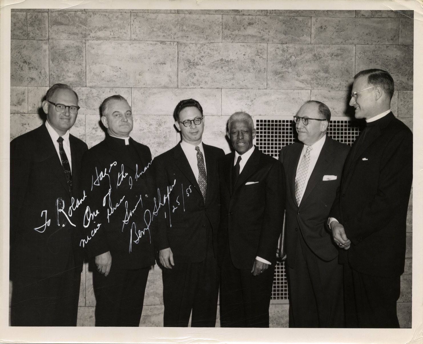 View of tenor Roland Hayes with colleagues from the Massachusetts Committee of Catholics, Protestants and Jews in Boston, Massachusetts. Autographed on front: "To Roland Hayes. One of the nicest persons I know. Sincerely, Benj. Shapiro, 1/25/55." Stamped on back: "Fay Foto Service Inc. 45 West Canton Street, Boston, KE 6-0018, Mass." Handwritten on back: "Meeting at an occasion of an assembly of Catholics, Christians and Jews in Boston."