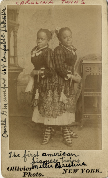 Portrait of singers Millie and Christine McKoy, the Carolina Twins. Printed on front: "Ollivier photo, New York." Handwritten on front: "Carolina Twins. The first American Siamese twins, Millie, Christina. Orville G. Mumford, 664 Canfielde [sic], Detroit, M." Printed on back: "I was born in the state of North Carolina, Columbus Co., Anno Domini, 1851. And pronounced by scientists to be the 8th wonder of the world. 'Tis not modest of one's self to speak, but daily scanned from head to feet, I freely talk of everything, sometimes to persons wondering. Some people say I must be two! The doctors say it is not true. Some cry out humbug, till they see, and then exclaim, 'great mystery.' Two heads, four arms, four feet, all in one perfect body meet. I am most wonderfully made, all scientific men had said. None like me since the days of Eve, none such perhaps shall ever live. If marvel to myself am I, why not to all who pass me by? I am happy too, because content; for some wise purpose I was sent. Our Maker knows what he has done, whether I'm created two or one. Respectfully, Millie Christine. The Carolina twin, surnamed the 2-headed nightingale."