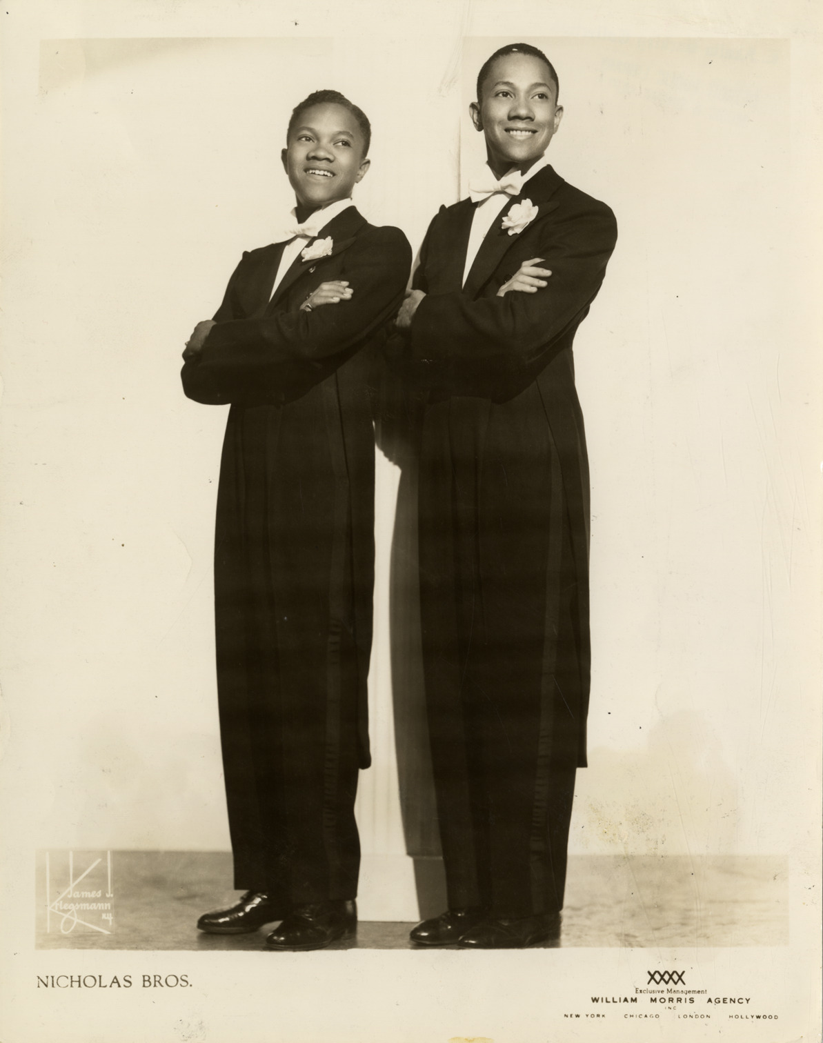 Portrait of dancers Fayard and Harold Nicholas, of the Nicholas Brothers. Printed on front: "Nicholas Bros. Exclusive management, William Morris Agency, Inc. New York, Chicago, London, Hollywood. James J. Kriegsmann, N.Y." Label on back: "In Edward Gross's production of 'St. Louis woman' gay musical about the gaudy nineties. Music by Harold Arlen. Lyrics by Johnny Mercer. Book by Arna Bontemps and Countee Cullen. Production directed and designed by Lemuel Ayers. Dance direction by Antony Tudor." Handwritten on back: "Famous dancing team, the Nicholas Brothers, Harold and Fayard act leading roles."
