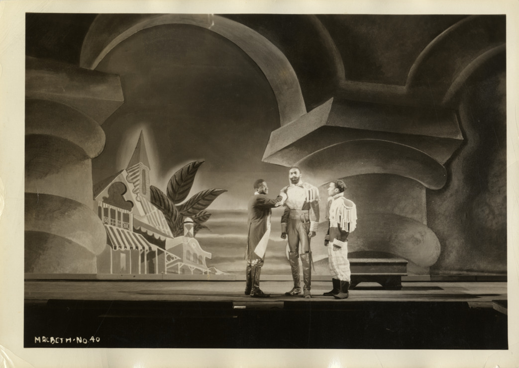 View of actor Maurice Ellis and two unidentified actors in a performance of "Macbeth" by the W.P.A. Federal Theatre Negro Unit. The production, directed by Orson Welles, was set in 19th century Haiti. Printed on front: "Macbeth, no. 40." Stamped on back: "Please credit W.P.A. Federal Theatre photos."