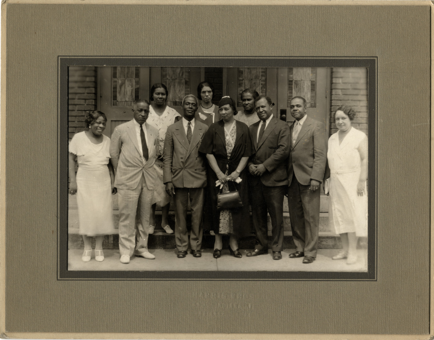 Favorite this☆ Kemper Harreld posing with group of men and women Description: View of violinist Kemper Harreld posing in front of building with group of unidentified men and women. Handwritten on back: "Kemper, Harreld." Details Resource ID: hk002592 Subject: Harreld, Kemper African American musicians Violinists Portraits, Group African American men African American women Photographic prints Date Issued: Unknown year Format: 1 photographic print mounted on mat board ; image 4.5 x 6.5 in. Member of: E. Azalia Hackley Collection Filing Location: Harreld, Kemper Rights: Physical rights are retained by DPL. Copyright is retained in accordance with U.S. copyright laws.