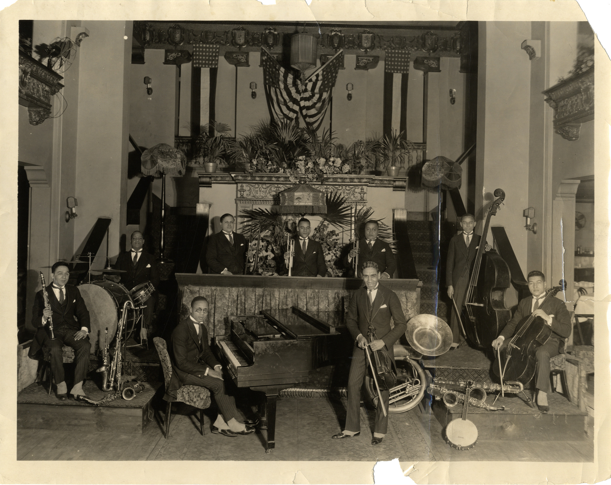 View of violinist Leroy Smith and his orchestra posing with musical instruments. Stage is decorated with lamps, potted plants and American flags; several musical instruments are displayed on stage steps and in foreground. Handwritten on back: "Leroy Smith Orchestra."
