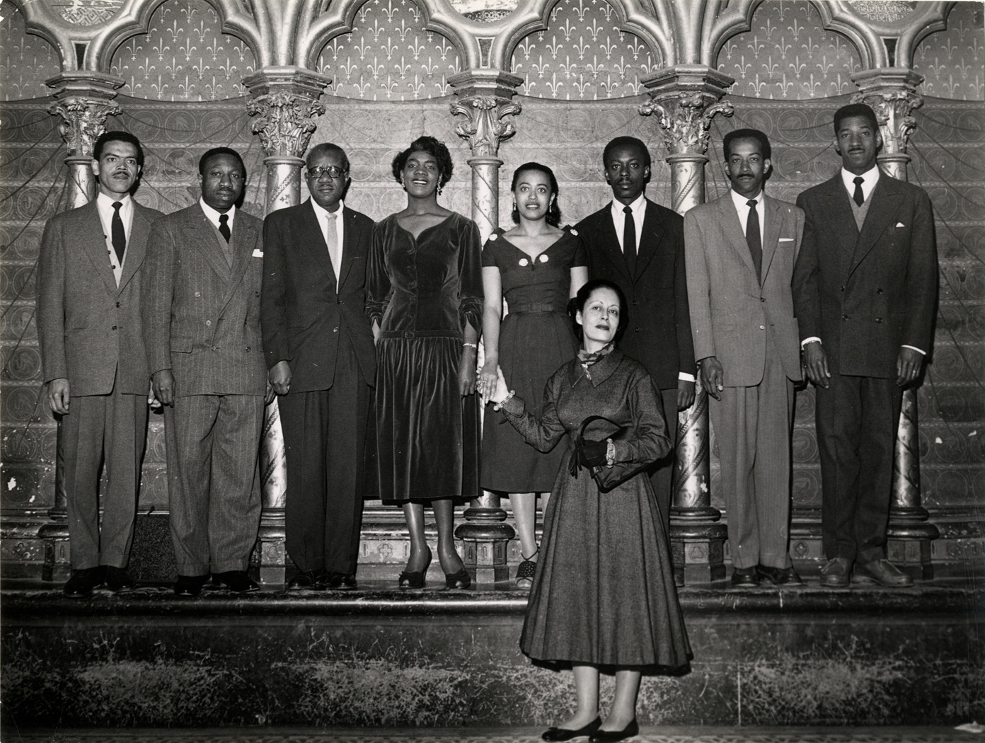 View of singer Gordon Heath posing with singers at Sainte-Chapelle in Paris, France. Stamped on back: "Studio Bernand, 106, rue de Richelieu, 106. Paris, 2e. Ric. 54-50. Cliche photo. B.M. Bernand." Handwritten on back: "Elwood Peterson, tenor; John Riley, baritone; Howard Swanson, arranger; Vera Little, contralto; Rhea Jackson, soprano; Marvin Hayes, bass; Andres Wheatley, harpsichordist; Gordon Heath, baritone/producer; Parmenia Egstrom (on floor), organizer. Ste. Chapelle, June, 1955."