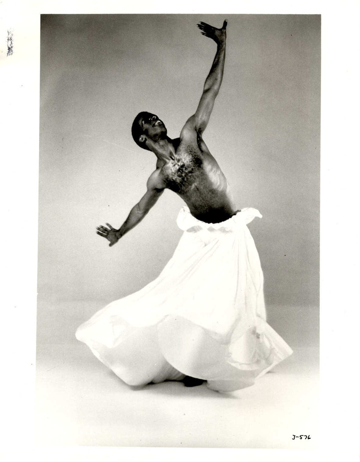 View of dancer Christian Holder performing in "Touch me." Label on back: "From the Joffrey Ballet, 130 W. 56th St., NYC 10019, 212-265-7300. Christian Holder in Gerald Arpino's new ballet, 'Touch me.' The costumes are by Geoffrey Holder and the music is by Reverend James Cleveland." Stamped on back: "Photo by Herbert Migdoll."