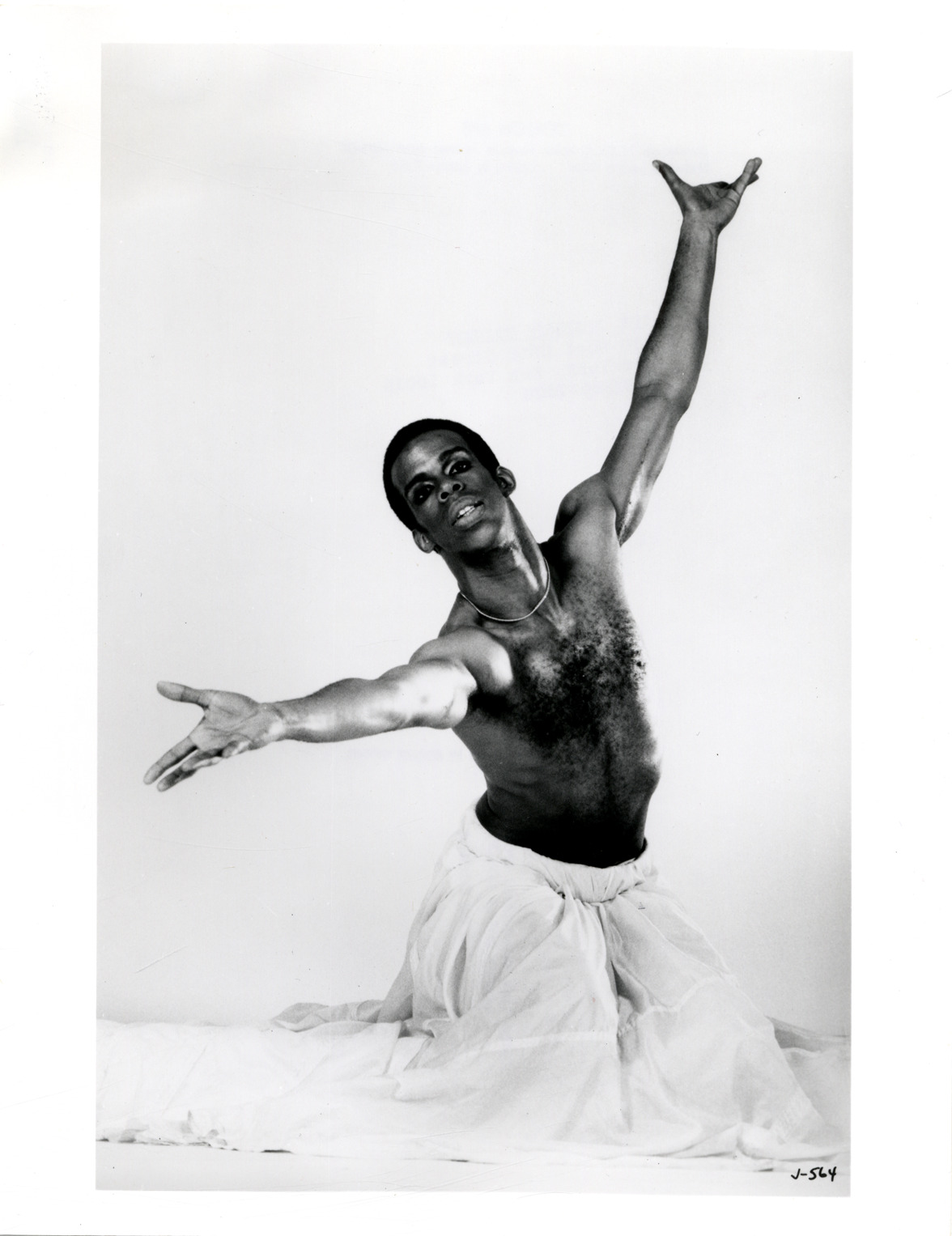 View of dancer Christian Holder performing in "Touch me." Stamped on back: "Touch me. Choreography by Gerald Arpino. Music by Reverend James Cleveland. Costume by Geoffrey Holder. Lighting by Jennifer Tipton. Christian Holder. The Joffrey Ballet, 130 West 56th Street, New York, New York 10019. 212/265-7300. Photo by Herbert Migdoll."