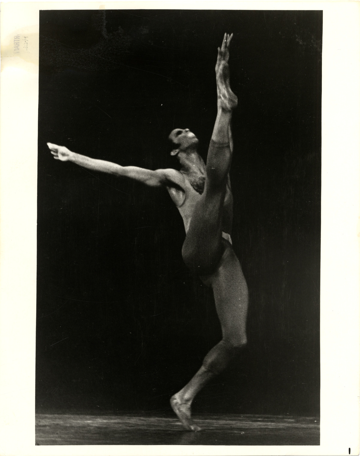 View of dancer Christian Holder performing in "Trinity." Stamped on back: "Trinity. Choreography by Gerald Arpino. Music by Alan Raph and Lee Holdridge. Lighting by Jennifer Tipton. City Center Joffrey Ballet, 130 West 56th Street, New York, New York 10019. 212/531-9676. Christian Holder."