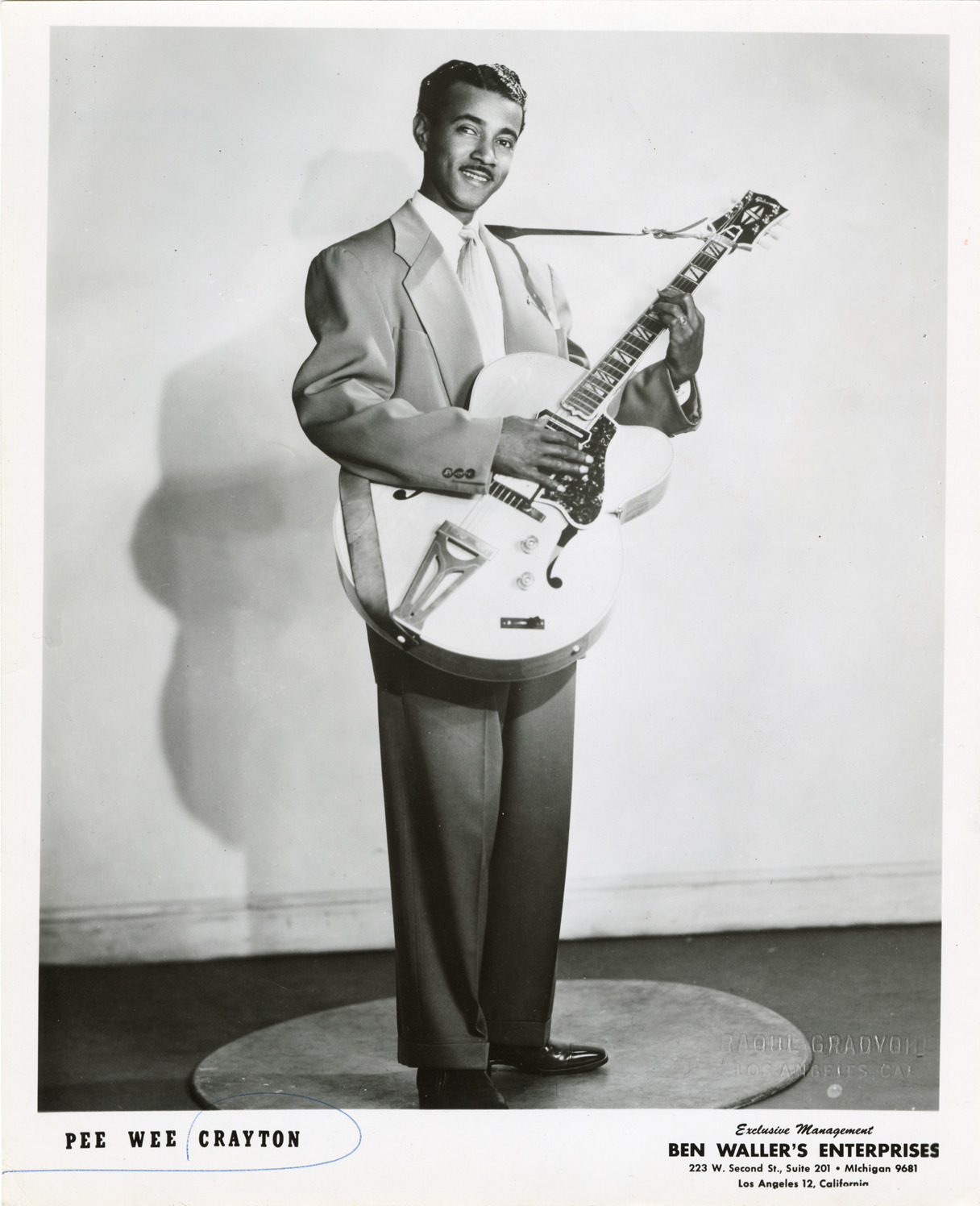 Favorite this☆ Pee Wee Crayton Description: Portrait of blues musician Pee Wee Crayton, holding a guitar. Printed on front: 'Raoul Gradvohl, Los Angeles, CA. Exclusive management, Ben Waller's Enterprises, 223 W. Second St., Suite 201, Michigan 9681. Los Angeles 12, California." Details Resource ID: hk002632 Creator: Gradvohl, Raoul, -1984 Subject: Crayton, Pee Wee African American musicians Guitarists Guitar Photographers--California--Los Angeles Photographic prints Date Issued: Unknown year Format: 1 photographic print ; 10 x 8 in. Member of: E. Azalia Hackley Collection Filing Location: Biography--Crayton, Pee Wee Rights: Physical rights are retained by DPL. Copyright is retained in accordance with U.S. copyright laws.