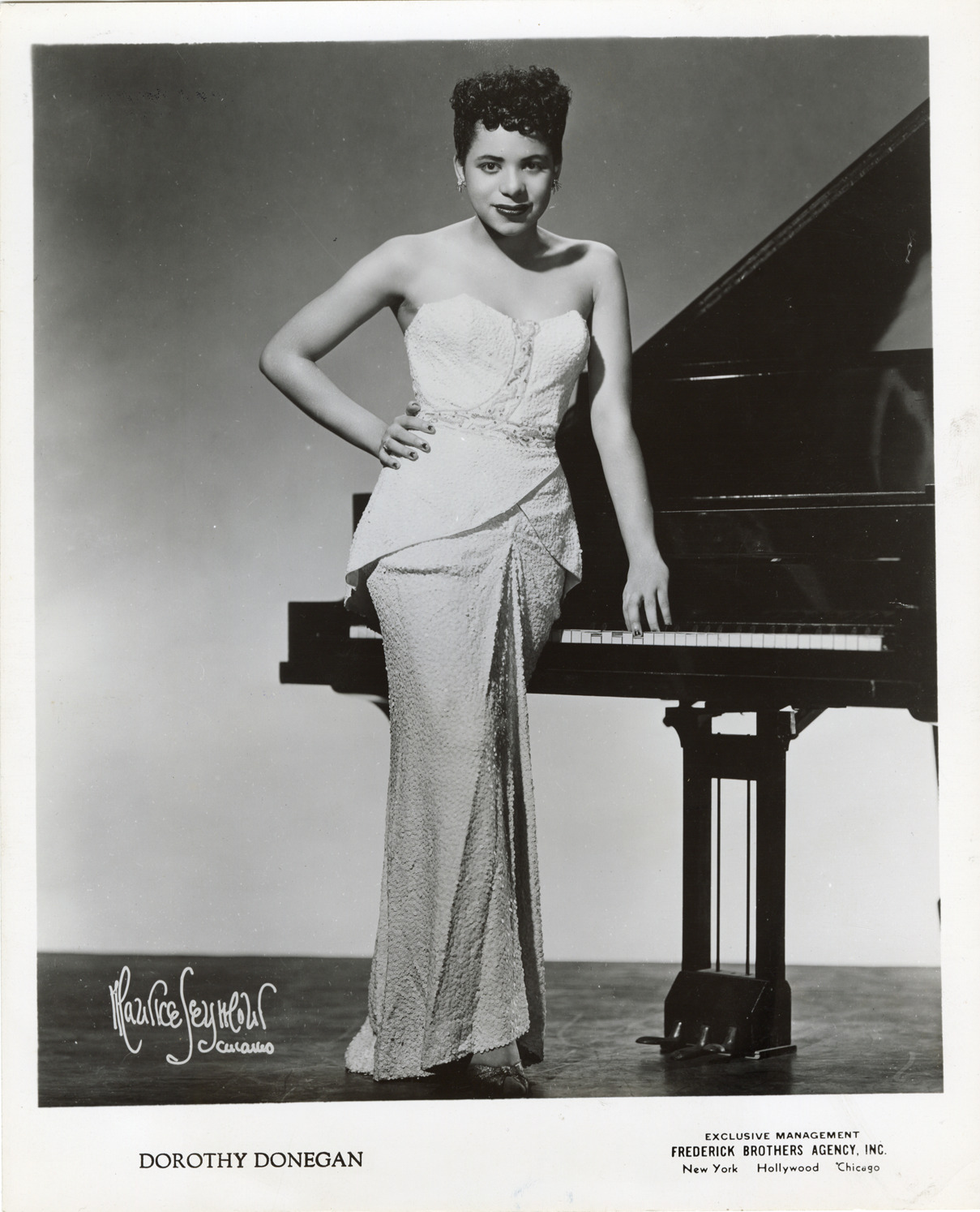 Portrait of pianist Dorothy Donegan. Donegan poses with a grand piano. Printed on front: "Dorothy Donegan. Exclusive management Frederick Brothers Agency, Inc., New York, Hollywood, Chicago. Maurice Seymour, Chicago." Label on back: "Downtown Theatre. Screen, Thur. Feb. 21st, 1946. 'The enchanted forest' in the glorious color of natures [sic] wonderland. Handwritten on back: "Dorothy Donegan."