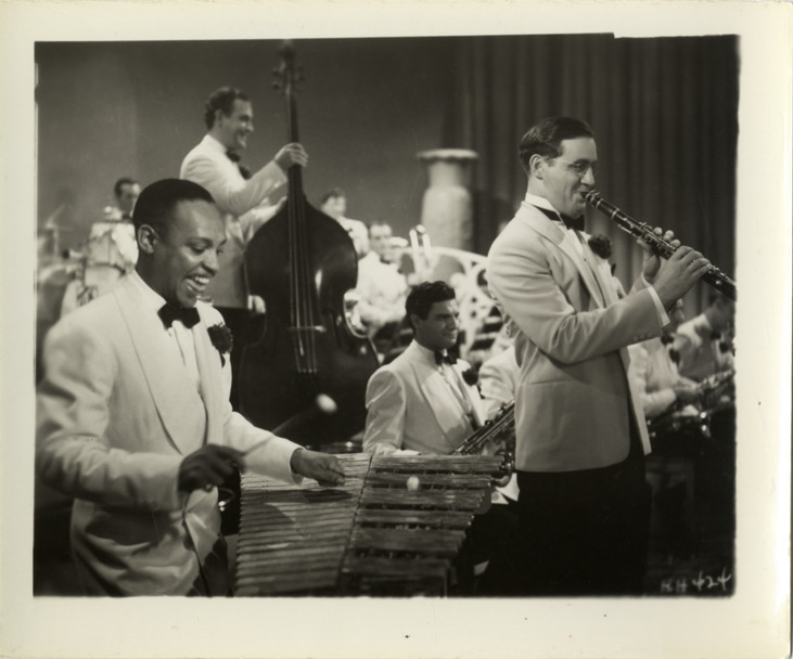 Favorite this☆ Benny Goodman and Lionel Hampton Description: View of clarinetist Benny Goodman and vibraphonist Lionel Hampton, performing with orchestra. Bass player in background. Details Resource ID: hk003631 Subject: Goodman, Benny, 1909-1986 Hampton, Lionel African American musicians Clarinet Clarinetists Vibraphonists Photographic prints Date Issued: Unknown year Format: 1 photographic print ; 4 x 5 in. Member of: E. Azalia Hackley Collection Filing Location: MS/Pliskow, Dan, 1:11,545 Rights: Physical rights are retained by DPL. Copyright is retained in accordance with U.S. copyright laws.