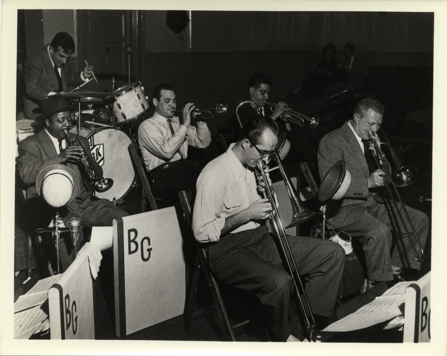 Favorite this☆ Roy Eldridge and musicians performing with the Benny Goodman orchestra Description: View of Roy Eldredge, trumpet, performing with the Benny Goodman Orchestra. Musicians play drums, trombone and trumpet. Handwritten on back: "Roy Eldredge." Details Resource ID: hk003647 Subject: Eldridge, Roy, 1911-1989 Benny Goodman Orchestra African American musicians Trumpet players Trombonists Drummers (Musicians) Drum set Trombone Trumpet Photographic prints Date Issued: Unknown year Format: 1 photographic print ; 8 x 10 in. Member of: E. Azalia Hackley Collection Filing Location: MS/Pliskow, Dan, 1:11,676 Rights: Physical rights are retained by DPL. Copyright is retained in accordance with U.S. copyright laws.