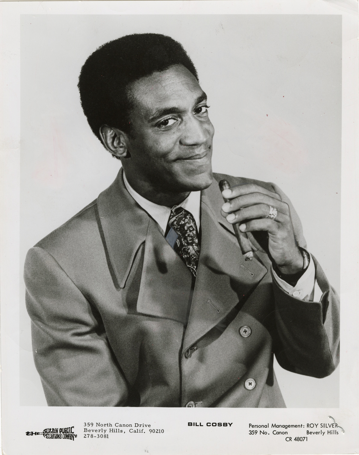 Portrait of comedian and actor Bill Cosby. Printed on front: "The Sutton Public Relations Company. 359 North Canon Drive. Beverly Hills, Calif. 90210. 278-3081. Bill Cosby. Personal management: Roy Silver. 359 No. Canon, Beverly Hills. CR 48071." Newspaper clipping on back: "Funnyman Bill Cosby, along with singer Carmen McRae and the Lionel Hampton Orchestra will perform in concert Friday evening at Masonic Auditorium." Handwritten on back: "Bill Cosby."