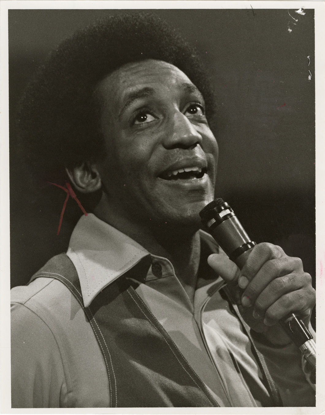 View of comedian and actor Bill Cosby, holding a microphone. Handwritten on back: "Bill Cosby."