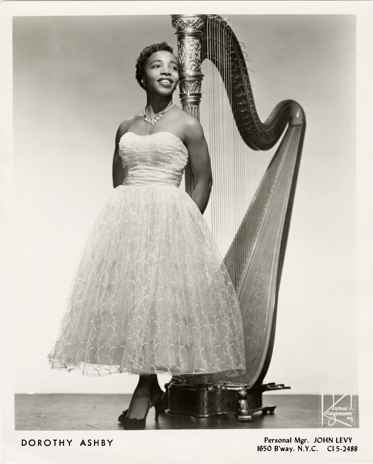 Favorite this☆ Dorothy Ashby Description: View of Dorothy Ashby posing with harp. Printed on front: "Dorothy Ashby. Personal mgr. John Levy. 1650 B'way, N.Y.C., CI 5-2488. James J. Kriegsmann, N.Y." Handwritten on back: "Ashby, Dorothy." Details Resource ID: hk003662 Creator: Kriegsmann, James J. Subject: Ashby, Dorothy African American women musicians Harpists Harp Photographers--New York (State)--New York Photographic prints Date Issued: Unknown year Format: 1 photographic print ; 10 x 8 in. Member of: E. Azalia Hackley Collection Filing Location: Biography--Ashby, Dorothy Rights: Physical rights are retained by DPL. Copyright is retained in accordance with U.S. copyright laws.