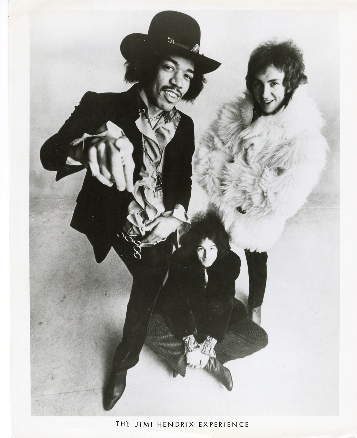 Group portrait of members of the Jimi Hendrix Experience; singer Jimi Hendrix, drummer Mitch Mitchell and bassist Noel Redding. Printed on front: "The Jimi Hendrix Experience." Typed on back: "From: Michael F. Goldstein, Inc. 1681 Broadway, New York, N.Y. 10019, LT 1-7600. Contact: Pat Costello. Jimi Hendrix Experience. Left to right: Jimi Hendrix, Mitch Mitchell (drums). Seated: Noel Redding (bass)."