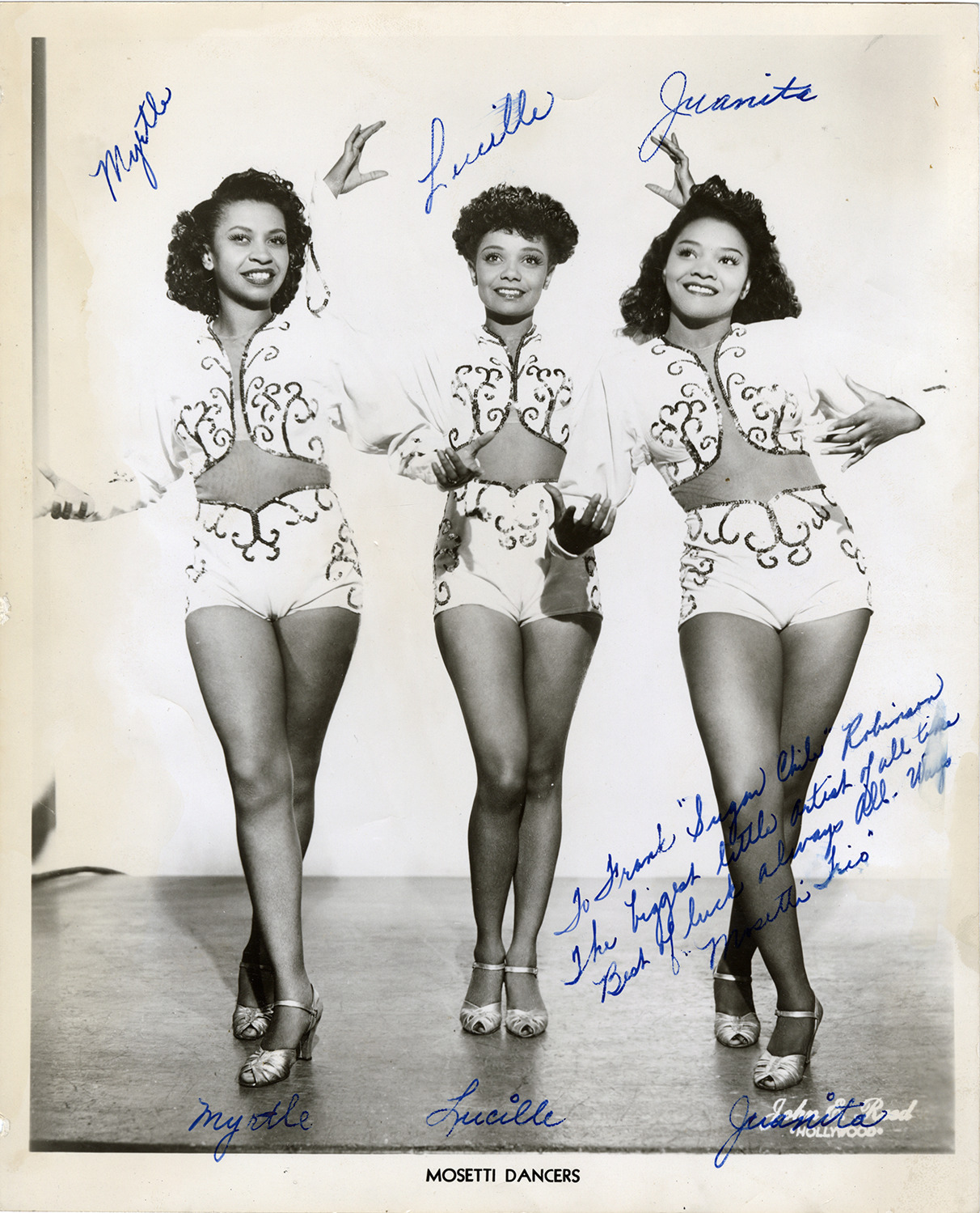 Portrait of the Mosetti Trio dancers. Autographed on front: "To Frank 'Sugar Chile' Robinson. The biggest little artist of all time. Best of luck all ways. Mosetti Trio." Printed on front: "Mosetti Dancers. John E. Reed, Hollywood." Handwritten on front: "Myrtle, Lucille, Juanita."
