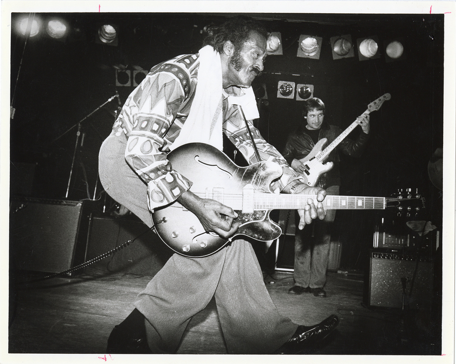 Favorite this☆ Chuck Berry Description: View of Chuck Berry playing guitar. Unidentified guitarist in background. Stamped on back: "Please credit Evangelos Dousmanis." Handwritten on back: "Chuck Berry doing his walk." Details Resource ID: hk003703 Creator: Dousmanis, Evangelos Subject: Berry, Chuck African American singers African American guitarists Photographic prints Date Issued: 1980 (year approximate) Format: 1 photographic print ; 8 x 10 in. Member of: E. Azalia Hackley Collection Filing Location: Biography--Berry, Chuck Rights: Physical rights are retained by DPL. Copyright is retained in accordance with U.S. copyright laws.