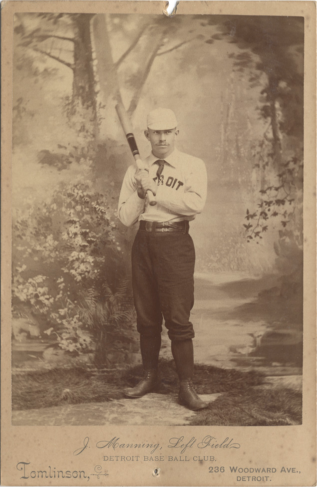 Favorite this☆ Jim Manning Description: Portrait of Jim Manning, Detroit Wolverines left fielder, posed in uniform with bat in front of painted woodland backdrop. Mustache. Printed on card front: "J. Manning, left field. Detroit base ball club. Tomlinson, 236 Woodward Ave., Detroit." Details Resource ID: hr000010 Creator: Tomlinson, Frank N. Subject: Manning, Jim (James H.), 1862-1929 Baseball players--Michigan--Detroit Photographers--Michigan--Detroit Cabinet photographs Albumen prints Photographic prints Date Issued: 1886 Format: 1 cabinet card ; image 5.5 x 3.75 in. Member of: Ernie Harwell Sports Collection Filing Location: Harwell Room Rights: Physical rights are retained by DPL. Copyright is retained in accordance with U.S. copyright laws.