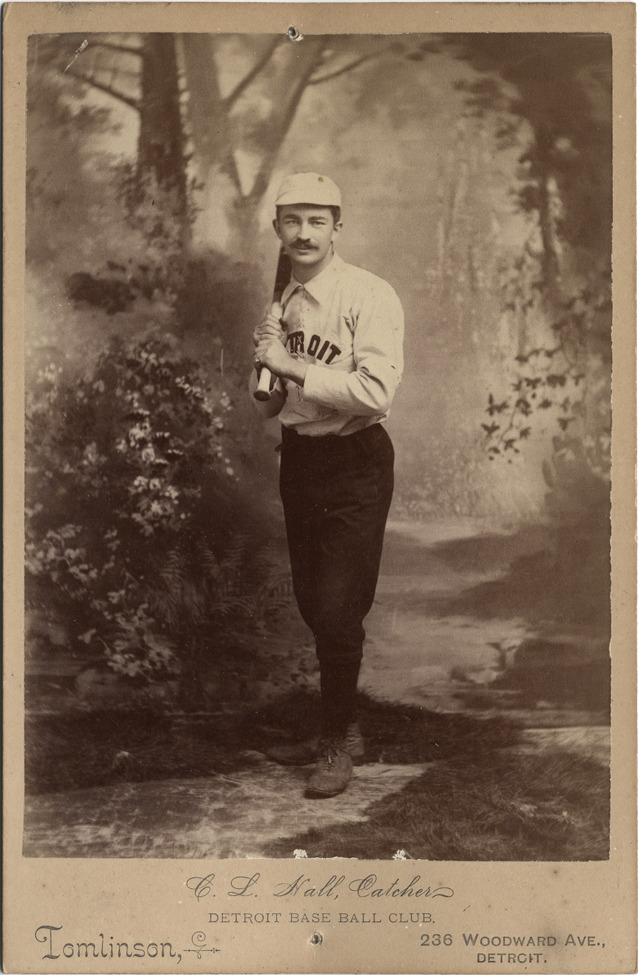Favorite this☆ C.L. Hall Description: Portrait of C.L. (Charles Lee) Hall, Detroit Wolverines catcher, posed in uniform with bat in front of painted woodland backdrop. Printed on card front: "C.L. Hall, catcher. Detroit base ball club. Tomlinson, 236 Woodward Ave., Detroit." Details Resource ID: hr000013 Creator: Tomlinson, Frank N. Subject: Hall, C.L. (Charles Lee) Catchers (Baseball)--Michigan--Detroit Photographers--Michigan--Detroit Cabinet photographs Albumen prints Photographic prints Date Issued: 1886 Format: 1 cabinet card ; image 5.5 x 3.75 in. Member of: Ernie Harwell Sports Collection Filing Location: Harwell Room Rights: Physical rights are retained by DPL. Copyright is retained in accordance with U.S. copyright laws.