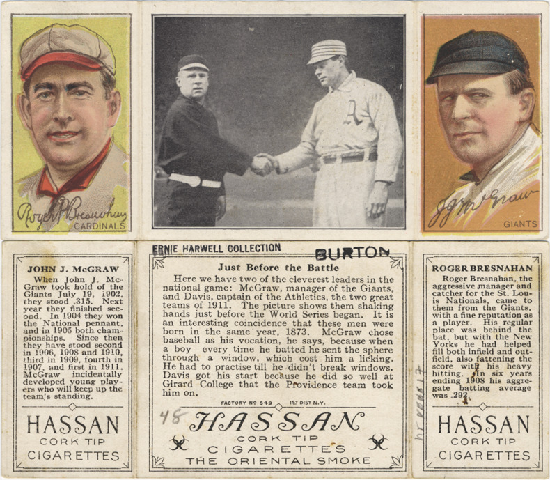 Portraits of Roger Bresnahan of the St. Louis Cardinals and John J. McGraw, manager of the New York Giants; in center of card is a view of McGraw and Harry H. Davis of the Philadelphia Athletics shaking hands before the 1911 World Series. Hassan Triple Folders (T202) series. Printed on back: "John J. McGraw. When John J. McGraw took hold of the Giants July 19, 1902, they stood .315. Next year they finished second. In 1904 they won the National pennant, and in 1905 both championships. Since then they have stood second in 1906, 1908 and 1910, third in 1909, fourth in 1907 and first in 1911. McGraw incidentally developed young players who will keep up the team's standing. Just before the battle. Here we have two of the cleverest leaders in the national game: McGraw, manager of the Giants, and Davis, captain of the Athletics, the two great teams of 1911. The picture shows them shaking hands just before the World Series began. It is an interesting coincidence that these men were born in the same year, 1873. McGraw chose baseball as his vocation, he says, because when a boy every time he batted he sent the sphere through a window, which cost him a licking. He had to practise till he didn't break windows. Davis got his start because he did so well at Girard College that the Providence team took him on. Roger Bresnahan. Roger Bresnahan, the aggressive manager and catcher for the St. Louis Nationals, came to them from the Giants, with a fine reputation as a player. He regular place was behind the bat, but with the New York he had helped fill both infield and outfield, also fattening the score with his heavy hitting. In six years ending 1908 his aggregate batting average was .292. Hassan cork tip cigarettes, the Oriental smoke. Factory no. 649, 1st dist. N.Y."
