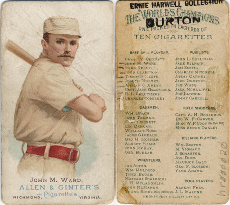 Portrait of John M. Ward holding a baseball bat. World's Champions (N28) series. Printed on front: "John M. Ward, Allen & Ginter's cigarettes, Richmond, Virginia." Printed on back: "The world's champions, one packed in each box of ten cigarettes. Lindner, Eddy & Clauss, lith., N.Y." and list of baseball players, pugilists, oarsmen, rifle shooters, billiard players, wrestlers and pool players.