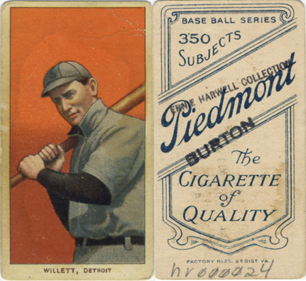 Portrait of Ed Willett, baseball player for the Detroit Tigers, holding a baseball bat. White Borders (T206) series. Printed on front: "Willett, Detroit." Printed on back: "Piedmont, the cigarette of quality; base ball series, 350 subjects. Factory no.25, 2d. dist. Va."