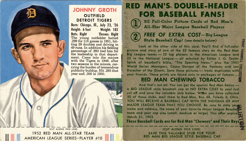 Portrait of Johnny Groth, outfielder for the Detroit Tigers. (T232) series. Printed on front: "Johnny Groth, outfield, Detroit Tigers. Born: Chicago, Ill., June 23, '26. Height: 6 feet. Weight: 185. Bats: right. Throws: right. The young outfielder batted .299 for 118 games in 1951, hitting 29 doubles and driving in 49 runs. In addition his fielding percentage of .993 tied him for the leadership in that department. Came into the majors with the Tigers in 1949, after two seasons in the minors, carrying the burden of tremendous publicity buildup. Hit .293 that year and .306 in 1950. 1952 Red Man All-Star team American League series, player #10." Printed on back: "Red Man's double-header for baseball fans! 1. 52 full-color picture cards of Red Man's all-star major league baseball players. 2. Free of extra cost, big league style baseball cap! (see details below). Look at the other side of this card. You'll find a full-color picture and story of one of the 52 famous stars on the Red Man big league teams -- 25 top players in the American League and 25 in the National League -- all selected by editor J.G. Taylor Spink of baseball's bible, "The Sporting News," plus the 1951 World Series managers, Casey Stengel of the Yankees and Leo Durocher of the Giants. Save these pictures -- trade these duplicates with your friends. These prints are found only in packages of famous Red Man chewing tobacco. And that's not all. You can get the special Red Man bonus -- a big league style baseball cap at no extra cost to you! Just cut off and save the valuable stub below. When you have collected 50 of these stubs, mail them to Red Man, Box 68, Toledo 6, Ohio. You will receive a baseball cap with the insignia of any major league team that you choose. Be sure to state your name and address, the name of your favorite major league baseball team and your cap size (small, medium and large). This offer expires March 31, 1953. These baseball cards are for Red Man 'chewers' and their boys. Save this valuable stub for your Red Man big league style baseball cap."