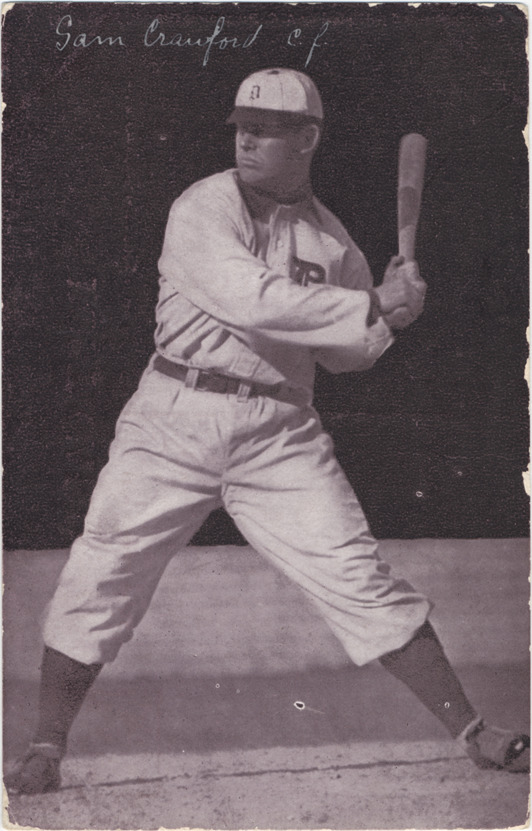 Sam Crawford posed in uniform with bat ready to swing. Handwritten on front: "Sam Crawford, C.F." Printed on back: "Samuel S. Crawford, center fielder of the Detroit Club and champion slugger of the American League, played his first professional ball in the Canadian League in 1898. He came to Detroit from Cincinnati during the player war in 1903. As a distance hitter and sure fielder he has no peer. Copyrighted and published by A.C. Dietsche, Detroit, Mich., 1907." Handwritten on back: "Mon. Nov. 16 '08, 5.30. I received Mother's letter this p.m. It has been quite cold here today and snowing off and on. I went downtown tonight and found out about trains going to Cleveland. I can leave here on the Lake Shore at 2.45 p.m. and get in Cleveland at 7.30 that night. I guess this is the one I had better take. Don't you?" Card is postmarked November 16, 1908.