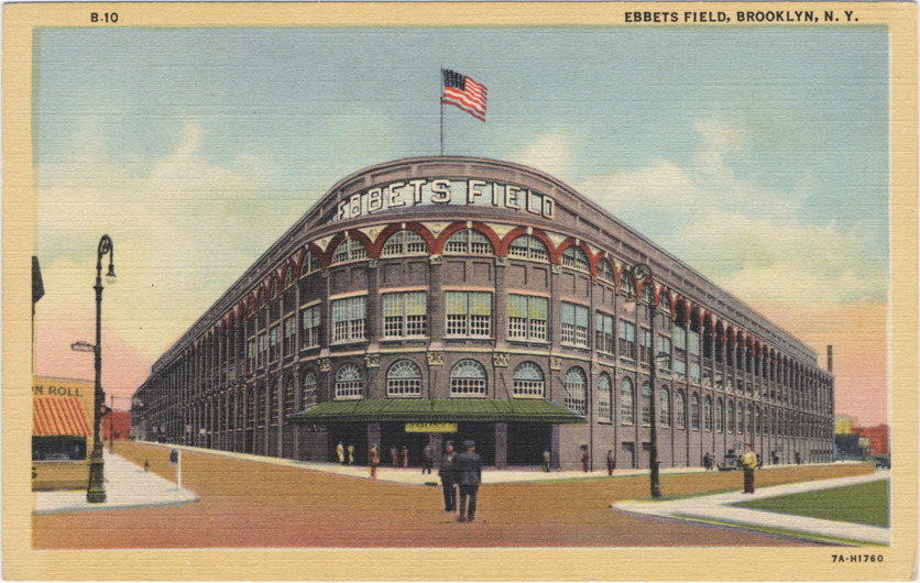 Entrance to Ebbets Field viewed from across intersection. People standing on sidewalk and streets. Cars parked on street. Printed on postcard front: "B-10. Ebbets Field, Brooklyn, N.Y. 7A-H1760." Printed on postcard back: "Interborough News Co., 525 West 52nd St., New York, N.Y. Genuine Curteich-Chicago 'C.T. art-colortone' post card."