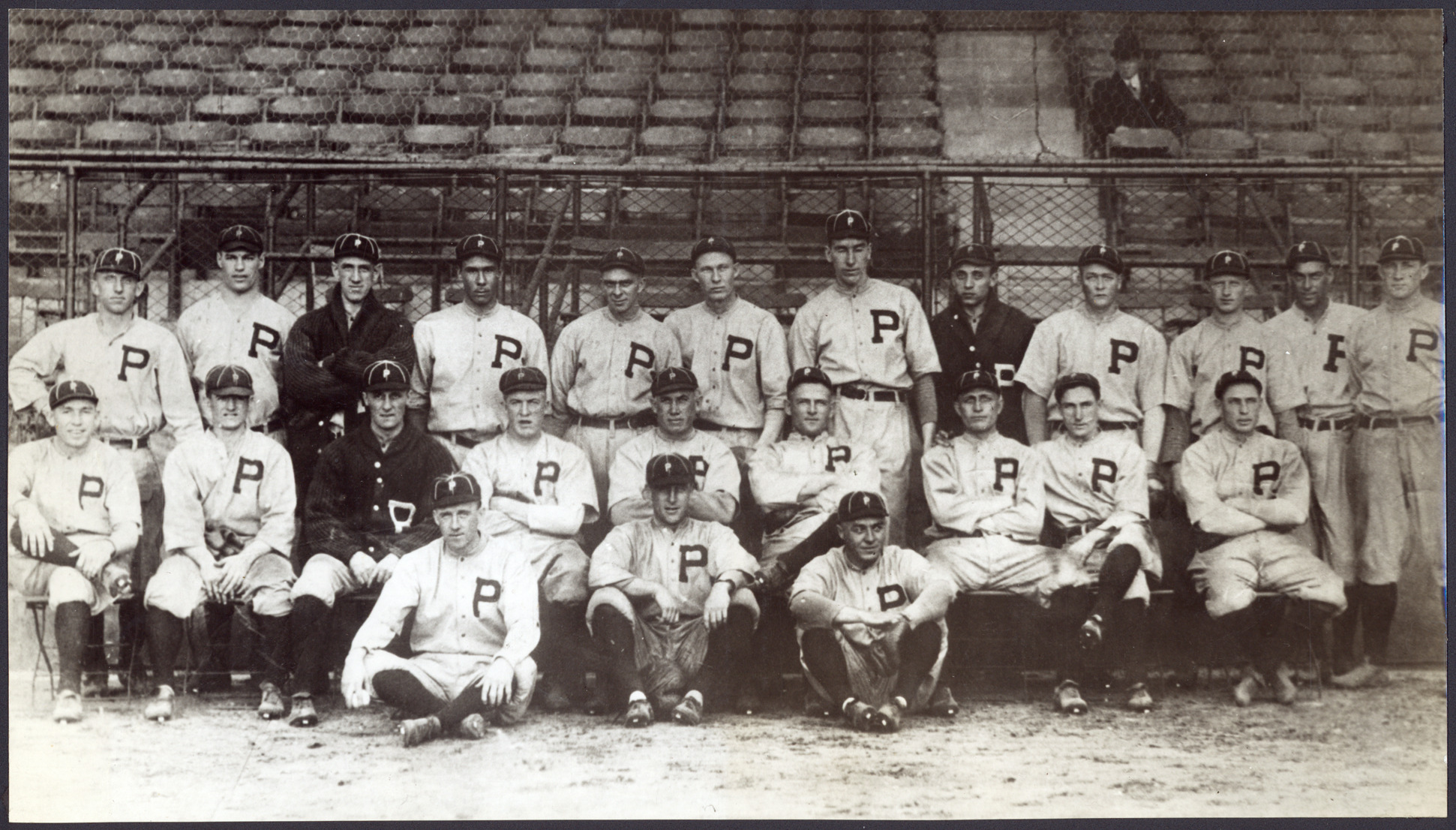 Group portrait of 1915 Philadelphia Phillies posing in front of grandstand. Man wearing suit sits in background behind fence. Label on back: "Philadelphia 'Phillies', 1915, National League champions. Left to right, top row, Becker, Baumgartner, Demaree, Tincup, Killefer, Adams, Rixey, Mayer, McQuillan, Weiser, Oeschger, Luderus. Middle row, Whitted, Stock, Chalmers, Alexander, Moran, manager, Cravath, Niehoff, Bancroft, Paskert. Bottom row, Byrne, Burns, Dugey."