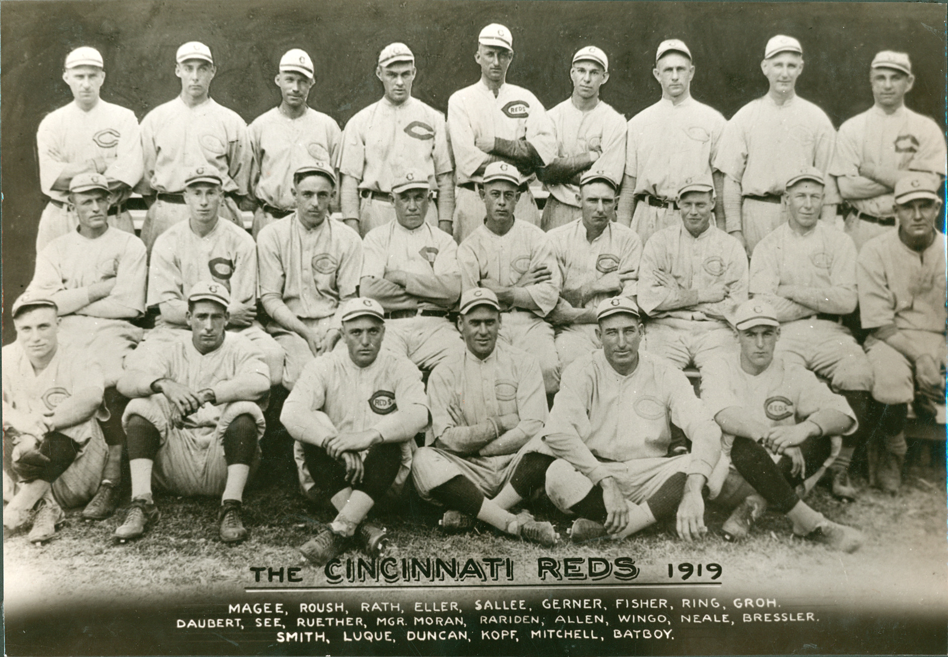 Favorite this☆ 1919 Cincinnati Reds Description: Group portrait of 1919 Cincinnati Reds. Printed on front: "The Cincinnati Reds, 1919. Magee, Roush, Rath, Eller, Sallee, Gerner, Fisher, Ring, Groh. Daubert, See, Ruether, mgr. Moran, Rariden, Allen, Wingo, Neale, Bressler. Smith, Luque, Duncan, Kopf, Mitchell, batboy." Details Resource ID: hr000092 Subject: Cincinnati Reds (Baseball team) Baseball players--Ohio--Cincinnati Photographic prints Date Issued: 1919 Format: 1 photographic print ; 9 x 12.5 in. Member of: Ernie Harwell Sports Collection Filing Location: Photographs-Oversize Rights: Physical rights are retained by DPL. Copyright is retained in accordance with U.S. copyright laws.