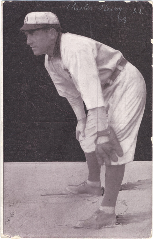 Charley O'Leary posed with hands on knees. Handwritten on card front, in faded white ink: "Charles O'Leary, s.s." Printed on card back: "Charles O'Leary, shortstop, is a Chicago boy. He was given a trial with the White Sox in 1901, his first professional engagement. During 1902 and 1903 he played with Des Moines of the Western League, and was purchased from them by Detoit. He is one of the best all-around shortstops in the American League and a star player. Copyrighted and published by A.C. Dietsche, Detroit, Mich., 1907." Handwritten on card back: "Thurs. Oct. 29 '08. 5.30p.m. Well how is everything? Got a postal from E. Mitchell this a.m. and he wants me to go over this Friday. He must be anxious to have me go over. Walk[ed] down to the depot and around tonight. Just got back. Everything O.K. Thinking of going to show tomorrow night. With love. E.A.S." Card is postmarked October 29, 1908.