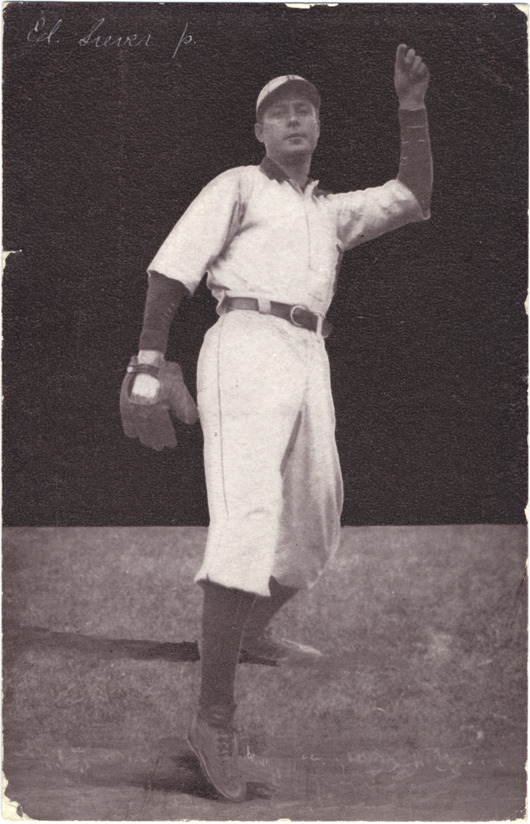 Ed Siever posed as if winding up to pitch, with no ball, facing camera. Handwritten on card front, in faded white ink: "Ed Siever, p." Printed on card back: "Edward Siever, left-handed pitcher of the Detroit Club, played his first ball on Nebraska and Kansas independent clubs. He came to Detroit in 1900. Copyrighted and published by A.C. Dietsche, Detroit, Mich., 1907." Handwritten on card back: "Tues. Nov. 10 08 4.00p.m. This has been a cloudy day and quite warm. Received Mother's letter and papers this a.m. Have not got time to write a letter as the exams. start tomorrow and I am putting in all my time on English. We have Eng. exams. tomorrow morning so have to work hard tonight on notebooks. E.A.S." Card is postmarked November 10, 1908.