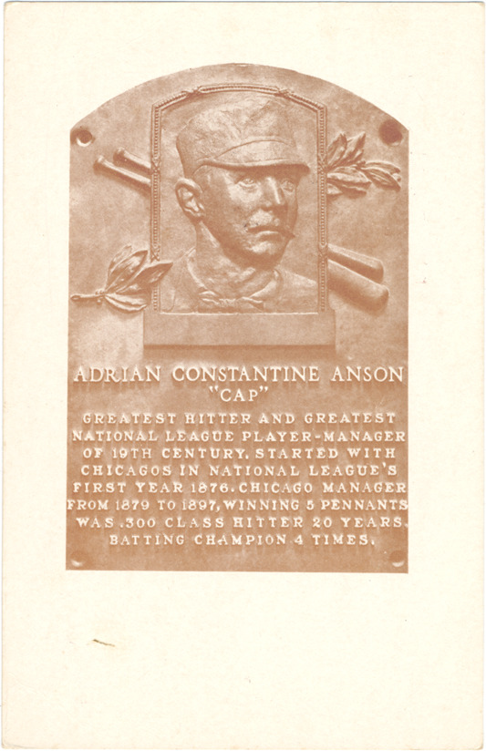 Closeup of plaque honoring Adrian Anson's 1938 induction into the Baseball Hall of Fame. Text on plaque reads: "Adrian Constantine Anson, "Cap." Greatest hitter and greatest National League player-manager of 19th century. Started with Chicagos in National League's first year 1876. Chicago manager from 1879 to 1897, winning 5 pennants. Was .300 class hitter 20 years. Batting champion 4 times." Printed on card back: "Base ball was invented in Cooperstown, New York, by Abner Doubleday and first played in this village in 1839. The National Base Ball Museum and Hall of Fame and Doubleday Field are maintained here as a shrine to the national game. Pub. by National Base Ball Museum."