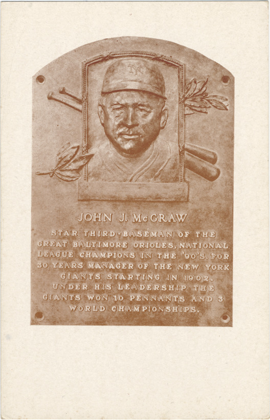 Closeup of plaque honoring John J. McGraw's 1937 induction into the Baseball Hall of Fame. Text on plaque reads: "John J. McGraw. Star third baseman of the great Baltimore Orioles, National League champions in the '90's. For 30 years manager of the New York Giants starting in 1902. Under his leadership the Giants won 10 pennants and 3 world championships." Printed on card back: "Base ball was invented in Cooperstown, New York, by Abner Doubleday and first played in this village in 1839. The National Base Ball Museum and Hall of Fame and Doubleday Field are maintained here as a shrine to the national game. Pub. by National Base Ball Museum."