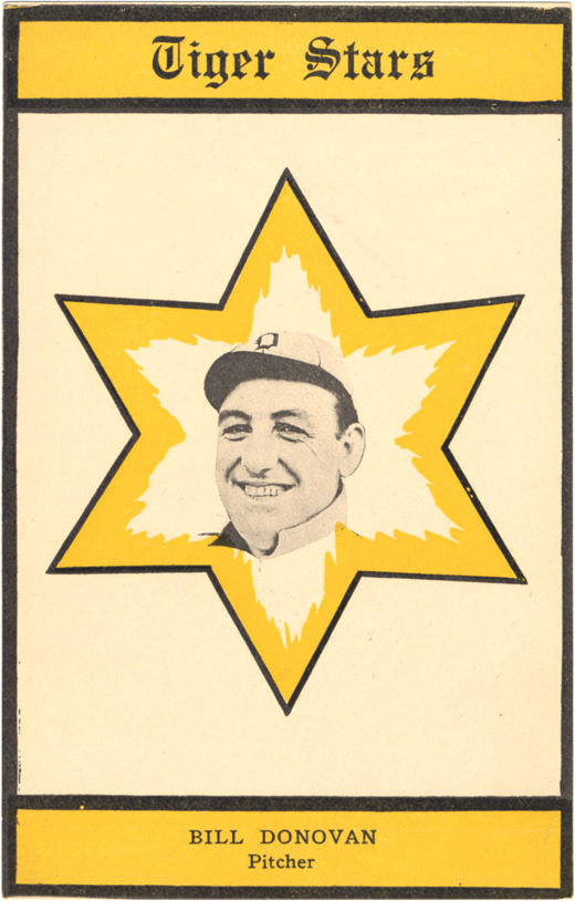 Favorite this☆ Bill Donovan Description: Portrait of Bill Donovan centered in six-pointed star with flame or leaf-shaped yellow highlights. Yellow areas at top and bottom contain text: "Tiger stars" and "Bill Donovan, pitcher." Printed on card back: "Topping & Co. publishers, Detroit." Details Resource ID: hr000144 Subject: Donovan, Bill (William Edward), 1876-1923 Pitchers (Baseball)--Michigan--Detroit Detroit Tigers (Baseball team) Postcards Publisher: Topping and Co. Date Issued: 1909 Format: 1 postcard : col. ; 5.5 x 3.5 in. Member of: Ernie Harwell Sports Collection Filing Location: Postcards-Biography-Donovan, Bill Rights: Physical rights are retained by DPL. Copyright is retained in accordance with U.S. copyright laws.