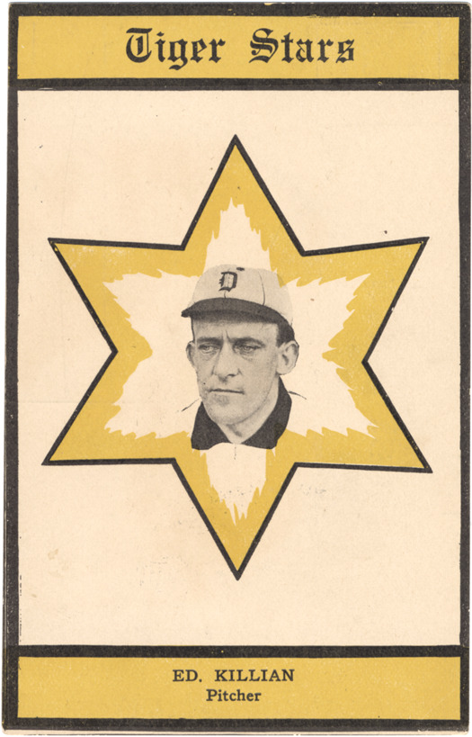Favorite this☆ Ed Killian Description: Portrait of Ed Killian centered in six-pointed star with flame or leaf-shaped yellow highlights. Yellow areas at top and bottom contain text: "Tiger stars" and "Ed. Killian, pitcher." Printed on card back: "Topping & Co. publishers, Detroit." Details Resource ID: hr000148 Subject: Killian, Ed (Edwin Henry), 1876-1928 Pitchers (Baseball)--Michigan--Detroit Detroit Tigers (Baseball team) Postcards Publisher: Topping and Co. Date Issued: 1909 Format: 1 postcard : col. ; 5.5 x 3.5 in. Member of: Ernie Harwell Sports Collection Filing Location: Postcards-Biography-Killian, Ed Rights: Physical rights are retained by DPL. Copyright is retained in accordance with U.S. copyright laws.