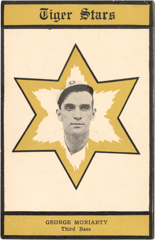 Portrait of George Moriarty centered in six-pointed star with flame or leaf-shaped yellow highlights. Yellow areas at top and bottom contain text: "Tiger stars" and "George Moriarty, third base." Printed on card back: "Topping & Co. publishers, Detroit."