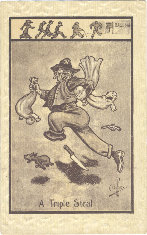 View of running man holding several crying infants, with gun, dog and knife in background. Inset drawing of woman and several men walking toward an entrance marked "Baseball." Printed on front: "A triple steal." Drawing is signed P. Crosby. Card has embossed edges.