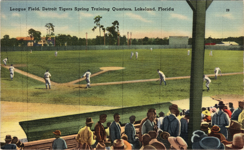 View of baseball players practicing at League Field, home of the Detroit Tigers spring training quarters in Lakeland, Florida. Spectators at ballpark watch practice from bleachers in foreground. Printed on front: "League Field, Detroit Tigers spring training quarters, Lakeland, Florida." Printed on back: "The average temperature at Lakeland, Florida is 74 [degrees] all year round. This is the metropolis of Polk County and has a permanent population of 25,000. Being 227 feet above sea level, it is tempered by breezes from the ocean and the Gulf which are within easy riding distance. Fishing, bathing and boating can be enjoyed on the 15 fresh water lakes which lie within the city limits with a recreational director managing weekly events. Two eighteen hole golf courses, a public library, air-conditioned first run moving picture houses and a municipal-owned water and electric plant are some of its many advantages. Tichnor quality views made only by Tichnor Brothers, Inc., Boston, Mass."