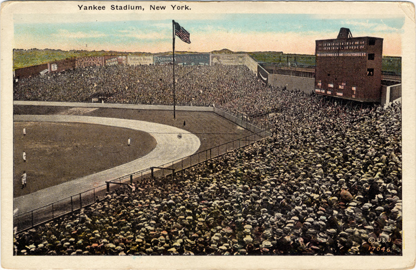 View of crowd watching baseball game at Yankee Stadium. Scoreboard and billboards around perimeter of ballpark. Printed on front: "Yankee Stadium, New York, 17046." Printed on back: "Copyright Underwood & Underwood, New York." Handwritten on back: "Dad favorite place. Edith." Card is postmarked August 22, 1925.