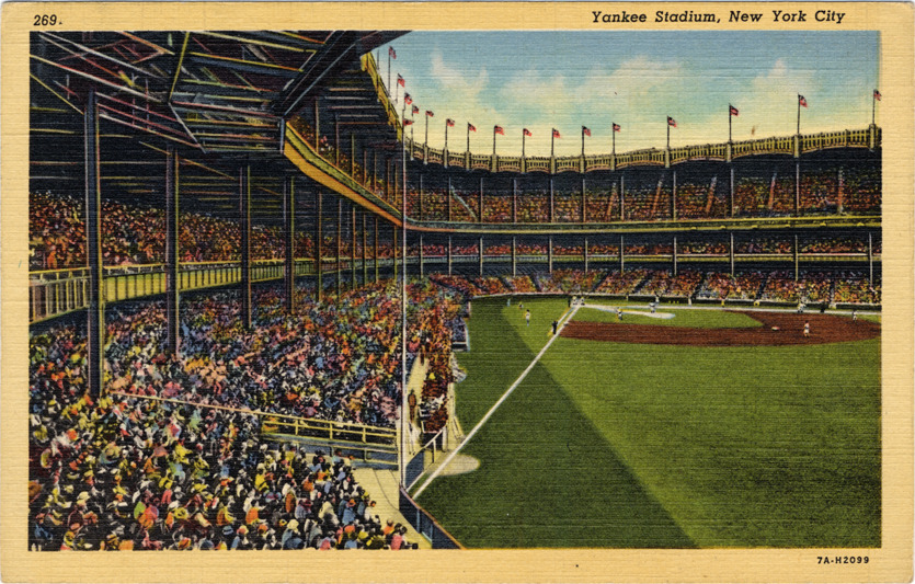 View of baseball game at Yankee Stadium. Crowds fill grandstand in ballpark; upper deck of grandstand is decorated with American flags. Printed on front: "Yankee Stadium, New York City, 7A-H2099." Printed on back: "Home of the New York American League baseball team. 161st St. and River Ave. Seating capacity 60,000. Interborough News Co., 525 West 52nd St., New York, N.Y. Genuine Curteich, Chicago 'C.T. Art-Colortone' post card."