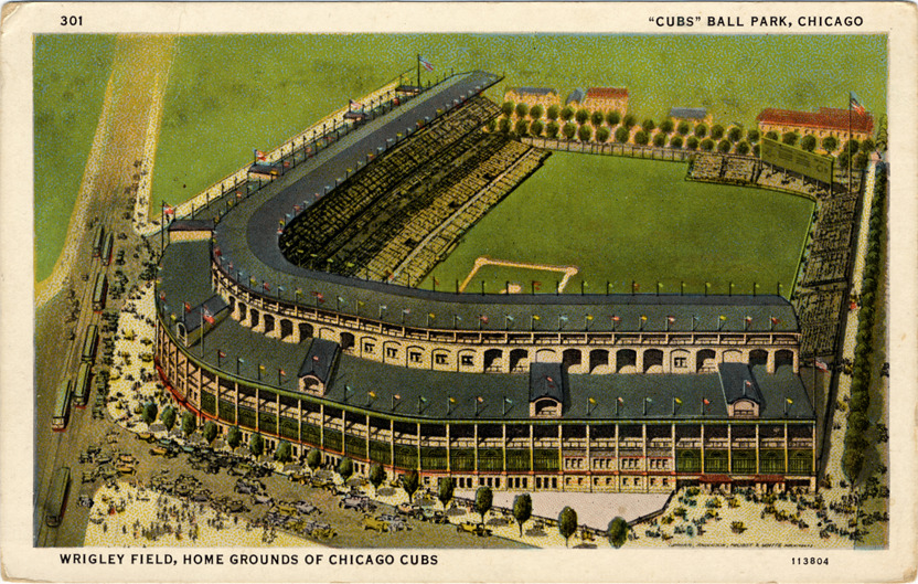 Bird's-eye view of Wrigley Field. Automobiles and pedestrians gather in front of ballpark entrance. Printed on front: "Wrigley Field, home grounds of Chicago Cubs, 11304. 301, 'Cubs' ball park, Chicago." Printed on back: "Wrigley Field at Addison and North Clark Streets, is double-decked and has seating capacity of about 45,000. The Chicago club is one of the charter members of the National Base Ball League started in 1876. Chicago and Boston are the only present members of the original league who have maintained continuous franchises since that date. 301 Max Rigot Selling Co., Chicago. 1933 Century of Progress, Chicago World's Fair. C.T. Co., Chicago."