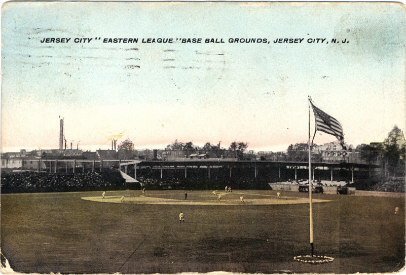 View of baseball game at ballpark in Jersey City, New Jersey. Crowds fill grandstand; American flag on flagpole in foreground. Printed on front: "Jersey City 'Eastern League' base ball ground, Jersey City, N.J." Printed on back: "Pub. by Junction Phonograph Co., A. Galuchie, prop. Commun[i]paw Ave. & Grand St., Jersey City." Handwritten on back: "Having dandy time. Glad you got the S.P. Mkt. See you Tuesday. Chas. Frey." Card is postmarked 1910.