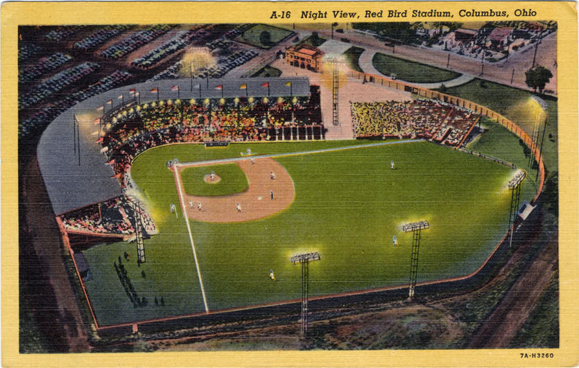 Bird's-eye view of Red Bird Stadium in Columbus, Ohio. Crowds fill grandstand; ballpark is illuminated. Red Bird Stadium was renamed Cooper Stadium in 1934. Printed on front: "A-16, night view, Red Bird Stadium, Columbus, Ohio, 7A-H3260." Printed on back: "W.E. Ayres, 1049 Livingston Ave., Columbus, Ohio. Genuine Curteich, Chicago 'C.T. Art-Colortone' post card."