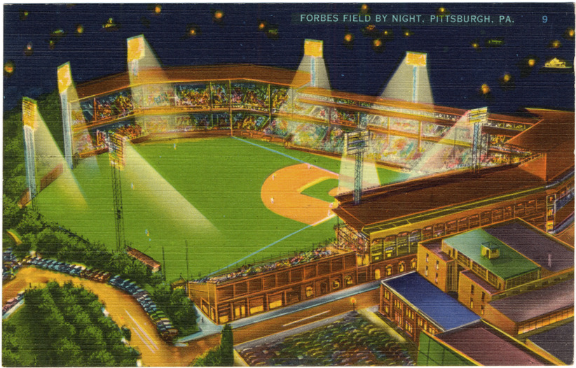 Bird's-eye view of night baseball game at Forbes Field in Pittsburgh, Pennsylvania. Crowds fill grandstand; baseball field is illuminated. Automobiles parked in lots adjacent to ballpark. Printed on front: "Forbes Field by night, Pittsburgh, Pa." Printed on back: "Imperial Greeting Card Co., Pittsburgh, Pa. A 'Colourpicture' publication, Boston 15, Mass., U.S.A."
