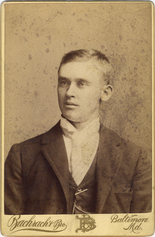 Portrait of man in suit, presumed to be a baseball player. Short side-parted hair. Coat with matching vest; striped tie, probably four-in-hand knot; wing collar. Fob with attached watch chain in vest buttonhole. Printed on card front: "Bachrach & Bro., Baltimore, Md."