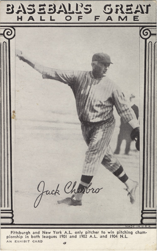 Portrait of pitcher Jack Chesbro. Hall of Fame Exhibits series. Printed on front: "Baseball's great Hall of Fame. Jack Chesbro. Pittsburgh and New York A.L. only pitcher to win pitching championship in both leagues 1901 and 1902 A.L. and 1904 N.L. An Exhibit card."