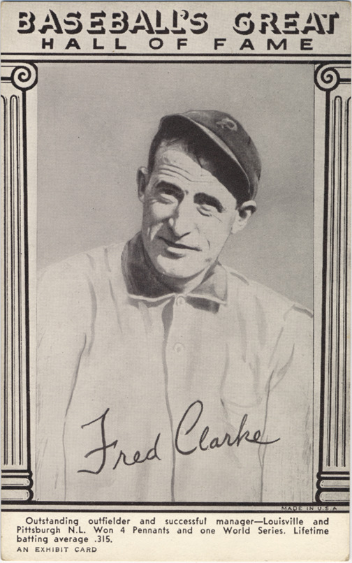 Portrait of baseball player Fred Clarke. Hall of Fame Exhibits series. Printed on front: "Baseball's great Hall of Fame. Fred Clarke. Outstanding outfielder and successful manager--Louisville and Pittsburgh N.L. Won 4 pennants and one World Series. Lifetime batting average .315. An Exhibit card."